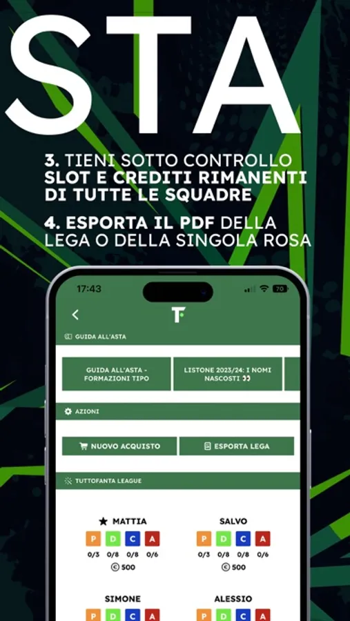 Grazie a EasyAsta, infatti, potrai gestire al meglio le tue risorse e trarre vantaggio sui tuoi avversari, applicando la strategia più corretta!