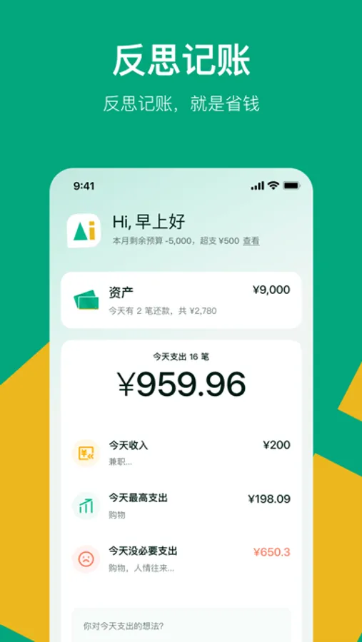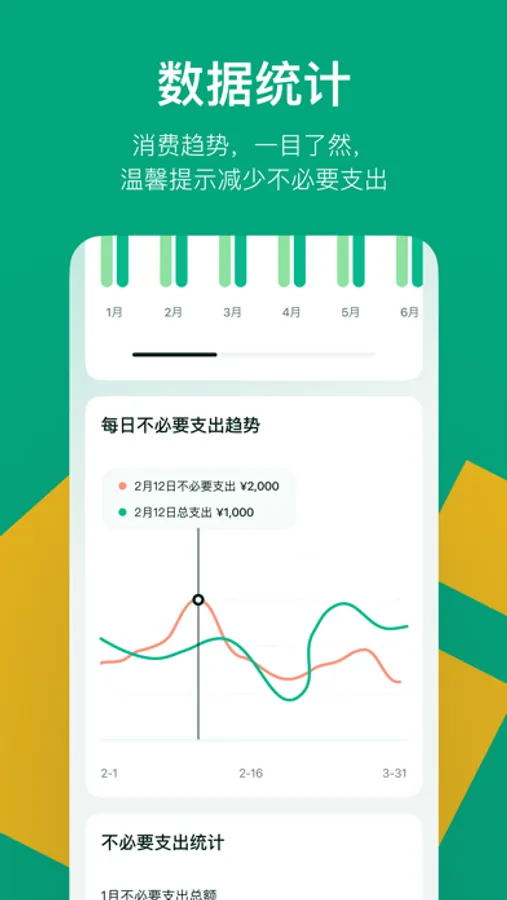 -- 数据统计,消费趋势,没必要支出,一目了然,还会温馨提示减少不必要支出;