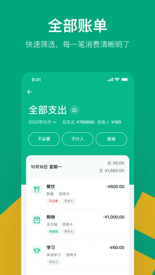 -- 全部账单,快速筛选,每一笔消费清晰可见;