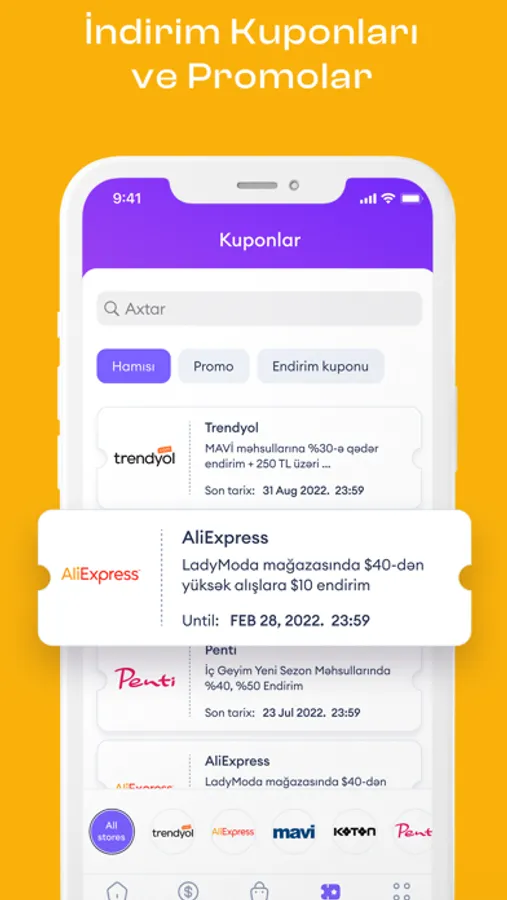 • En büyük internet mağaza ve markaların sitelerinden alışveriş yapa bilirsiniz: Trendyol, Aliexpress, Morhipo, Boyner, eBay, DeFacto, Koton, Bershka, MAVİ, Stradivarius ve başkaları