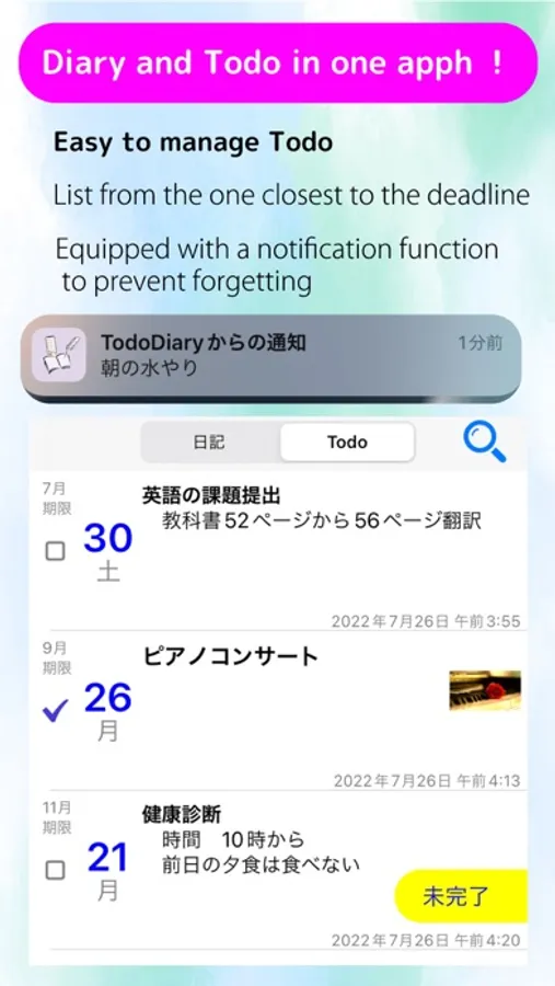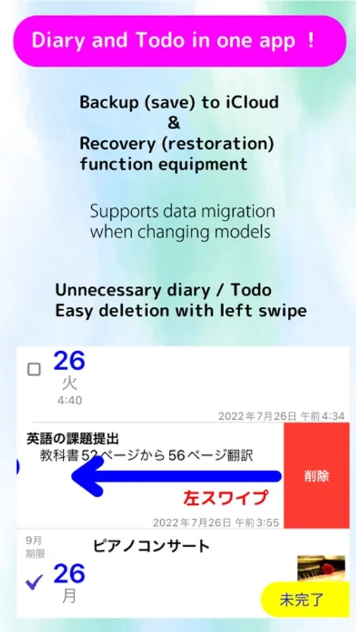 You can delete diaries, Todos, and photos that are no longer needed by swiping left.