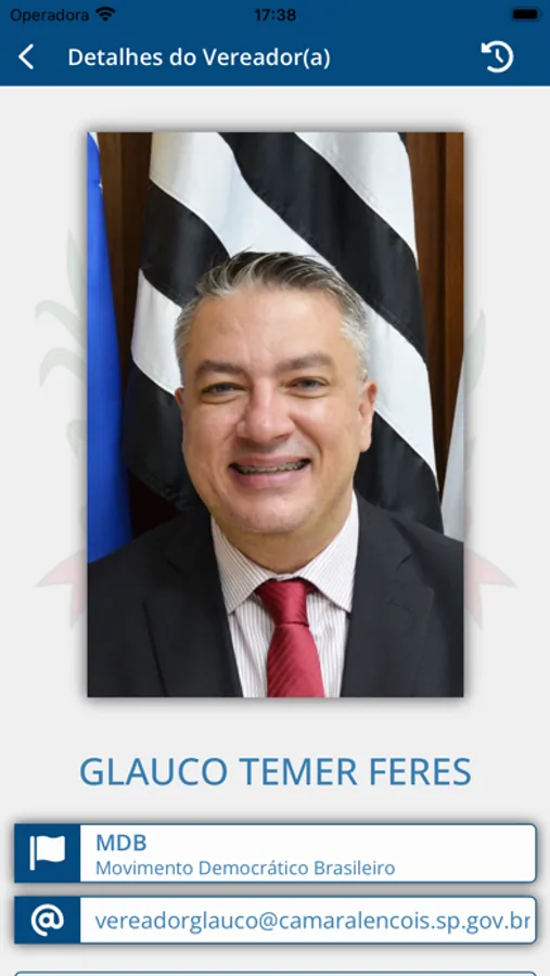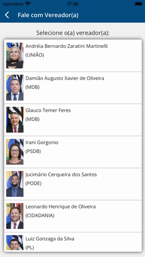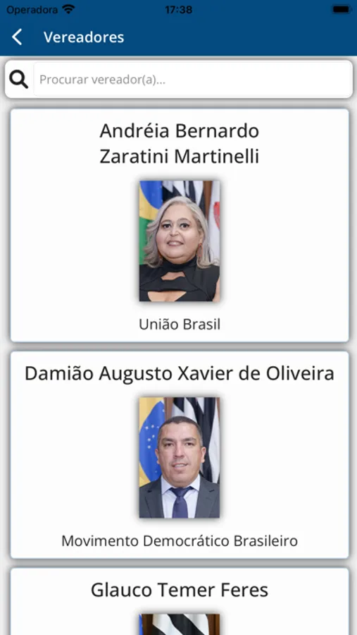 • Consulta a listagem dos Vereadores em exercício, exibindo o nome, partido, e-mail, telefone, links para proposituras apresentadas, frequência nas sessões e votos nominais;