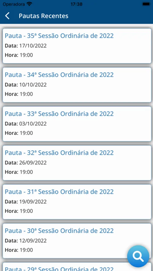 • Consulta aos documentos de sessão(Pautas e Atas da Ordem do Dia), mostrando as seguintes informações: número da sessão, tipo da sessão, data e hora da reunião e observações, texto da mesma, e tramitação.