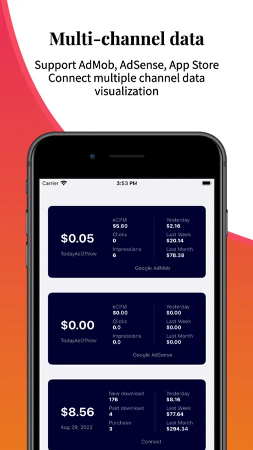 - Multi-channel revenue data: Supports AdMob, AdSense, App Store Connect multiple channel data access at the same time, can display your current real-time revenue, eCPM, clicks, impressions, and yesterday and last week's revenue.