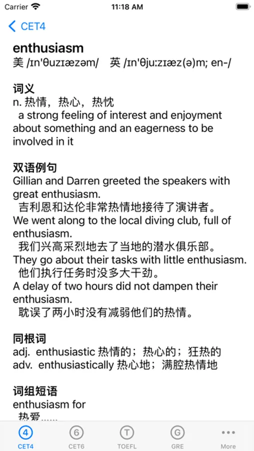Massive English words, covering bilingual meanings, bilingual example sentences, homologous words, phrases, synonyms, etc. of each word, to meet the needs of study and examination.