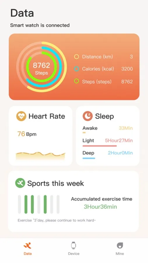 A tool app that provides users with a convenient experience of using wearable products, and can view step counting, sleep, exercise and other data through the app. Check the status of the device at any time, browse the running status of the device, and view the information of the connected device. Record your own physical condition and understand the information of your standard body in real time. Provides many setting tools, including sedentary reminders, water drinking reminders, sleep reminders, etc. Daily steps, sleep data, etc. can be well known. Count the number of daily exercise steps and generate corresponding data reports.