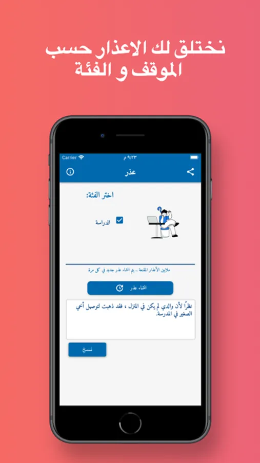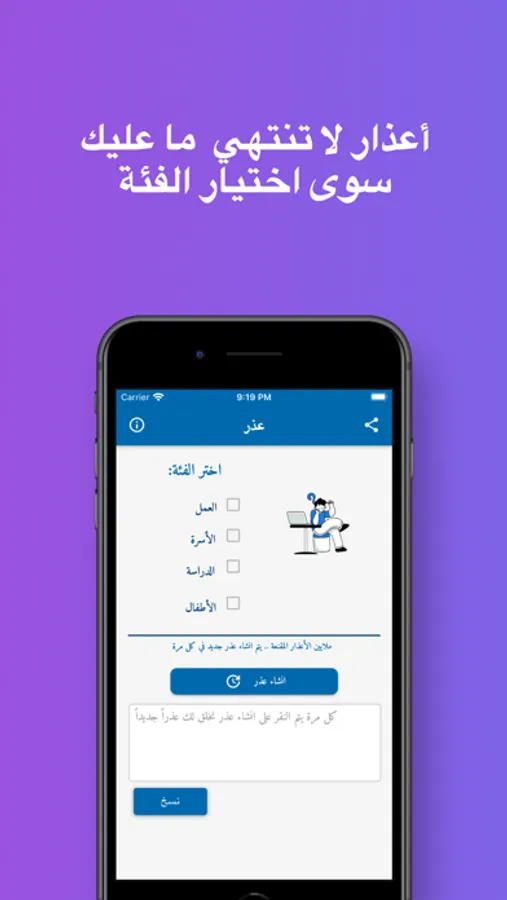 - يمكن اختيار عذر عشوائي أو تحديد الفئة المستهدفة من مديرك بالعمل أو اسرتك بالمنزل أو أصدقائك .