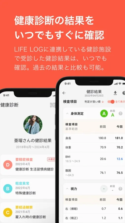 健診機関で行った健康診断の結果が、受診後に自動でアプリに反映され、いつでも確認することができます。必要に応じて結果データをPDFダウンロードも可能です。
