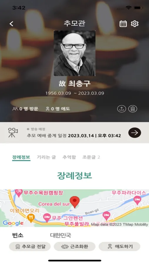 메모리온에서 중계하는 장례식에 참여하시고, 그분들의 추모관에 마음을 전달하세요.