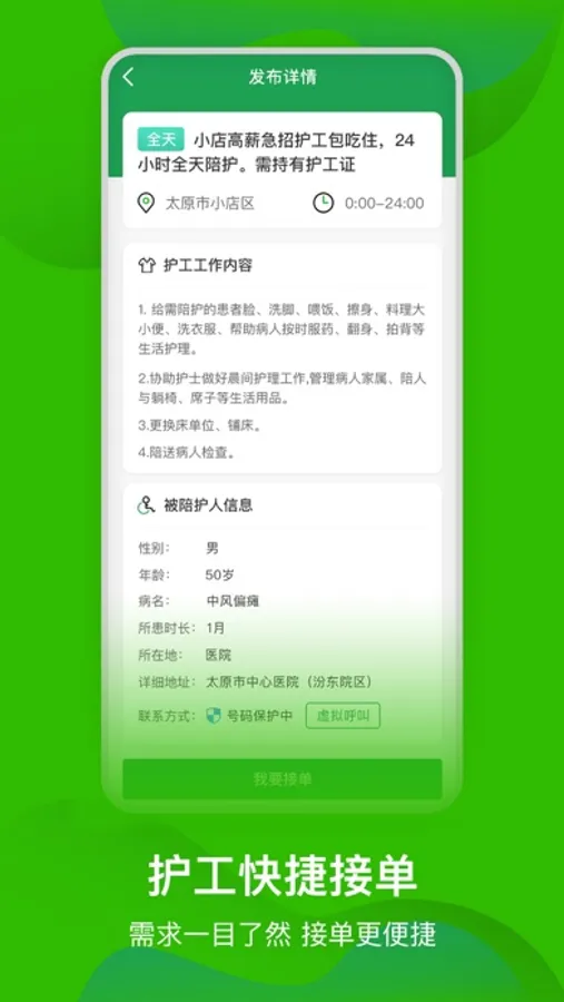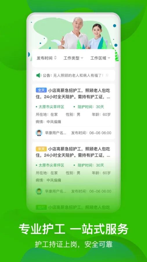 随着社会少子化,老龄化问题日益突出,针对老年及病人看护的公司,太原早康护工服务经营部应运而生!总部设在山西太原市的太原早康护工服务经营部于2022年5月31号成立了!该企业位于山西省会太原市迎泽桥西,西矿街北二条社区,分为线上和线下两大部,线下部有员工护工人员约50人左右,负责太原市各大医院病房陪护和社区老年人的入户培护工作。线上部定制一款app软件,服务全国范围有陪护需求的病人和老年人,可以在手机上下单,手机上接单,快速下单,快速接单,快速到达,早康线上注册护工均持有护工证和三年以上从业经历!经过平台认真审核和挑选准予线上接单。