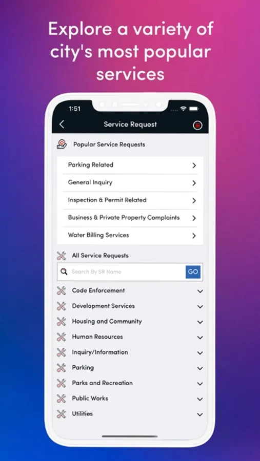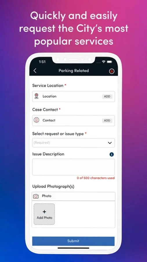 • The 'Create New Service Request’ feature allows you to quickly and easily request the City’s most popular services, including streetlight outtage, pothole repair, and bulky-item pickup .