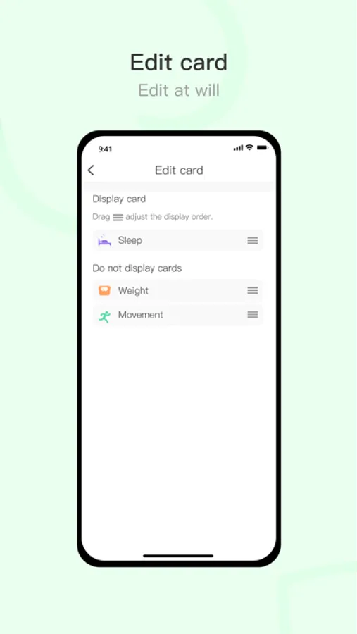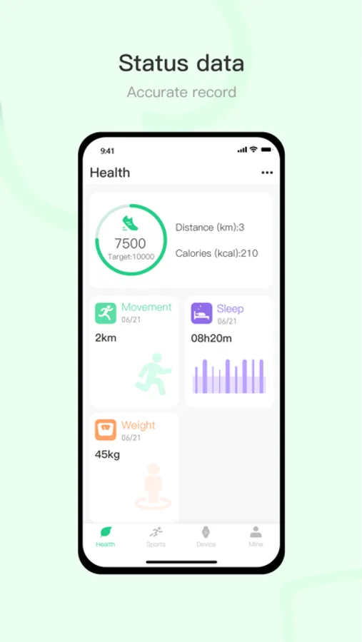 1. Health data display: Record physical status data such as steps, sleep, weight and so on.