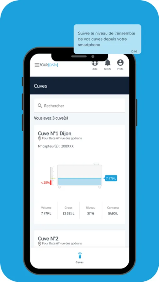 FOUR DATA, à travers son catalogue de jauges connectées et modules web, vous permet d'équiper et visualiser facilement différents types de matériels pour faciliter les interventions (demande de remplissage, pompage, maintenance opérationnelle, remontée de défaut, etc.),d’aider le personnel de vente et de logistique dans ses tâches commerciales stratégiques et opérationnelles.