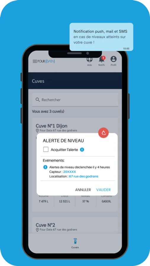 - Paramétrage d'alertes de niveau, mouvements ou de changements d'état