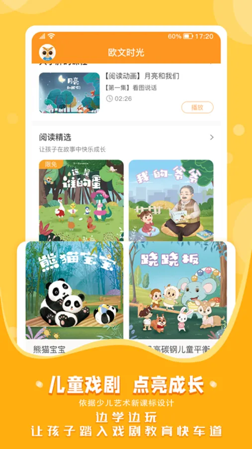 欧文时光旗下内容包括《儿童玩剧盒》、《游戏王国》、《欧文讲故事》等多种系列产品,紧紧围绕 “戏剧+”成长体系设计,内容涵盖戏剧表演、绘本阅读、语言发展、动手创造、思维训练等5大综合领域,让不同年龄段的孩子都可以全身心投入其中。