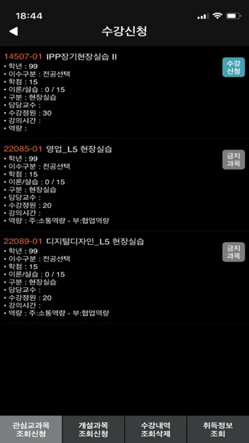 - 개설과목 조회 후 수강신청