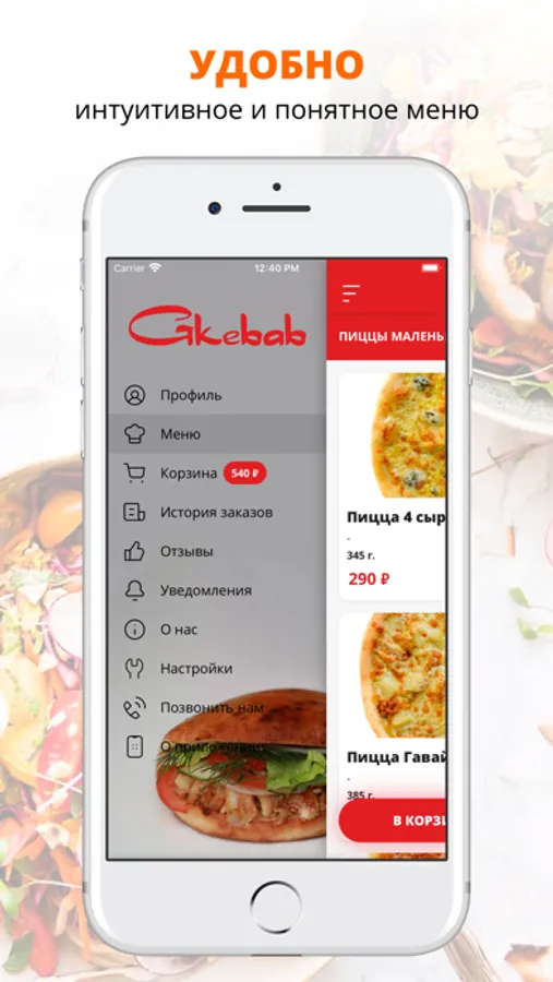 В меню неповторимый кебаб, искендер, коробочки gbox, куриные чупсы, картошка фри и даже пицца!