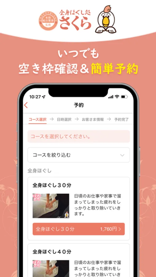 アプリをインストールしていただくことにより全身ほぐし処さくらを、より便利に身近にご利用していただけます。