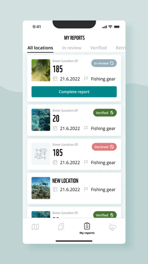 The app shows you potential positions of ghost nets on a map. With your support we will find out, whether the find really is a ghost net! Dive at the location and verify the position. With this important information, the recovery of lost fishing gear can be optimally prepared and the nets recovered by specially trained divers.