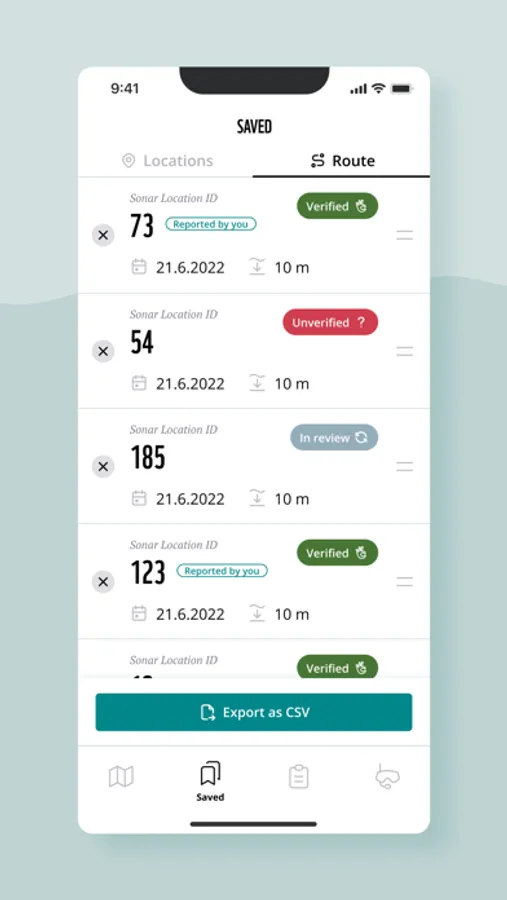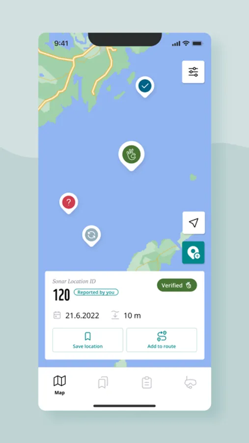 The app shows you potential ghost net locations on a map. These points were determined using a sonar device, which maps the seafloor. Save interesting points in the app and use the route function to plan your next dive. The routes can be exported as .gpx files.