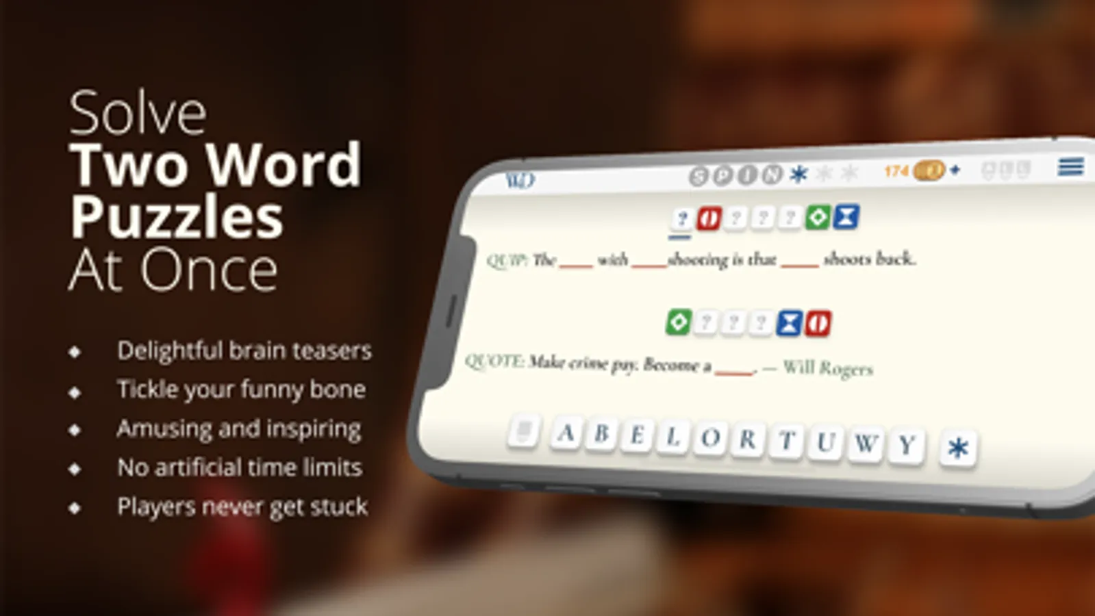 WORD DUO players can work on two puzzles at the same time. As one puzzle is solved, the answer for the second puzzle gets partly filled in as well. Players are presented with a variety of engaging word puzzles, including witty jokes, clever puns, famous quotes, wise old sayings, word associations, and more.