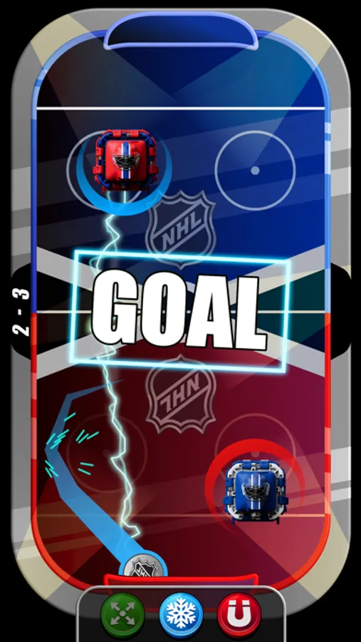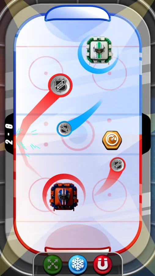 -Boosters: Collect the different boosters (duplicity, invisibility, speed up or mini puck, wall builder and shot on goal) from the ice and use them to get your victory.