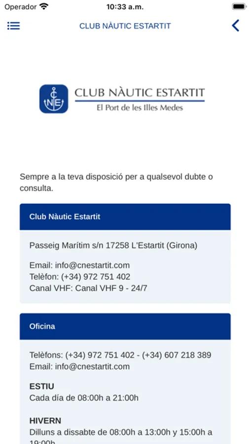 Aplicación oficial del Club Nàutic Estartit de uso exclusivo para socios y clientes del club a modo de oficina virtual. Incluye avisos, datos del socio o cliente, documentación personal, documentos del club, , información del amarre y acceso a las facturas y recibos con opción de pago con tarjeta de crédito. Disponible en catalán, castellano e inglés.