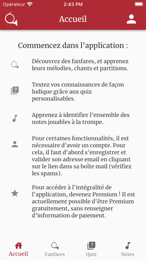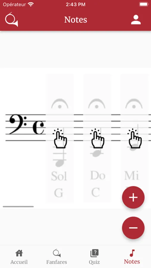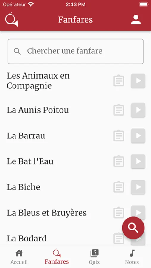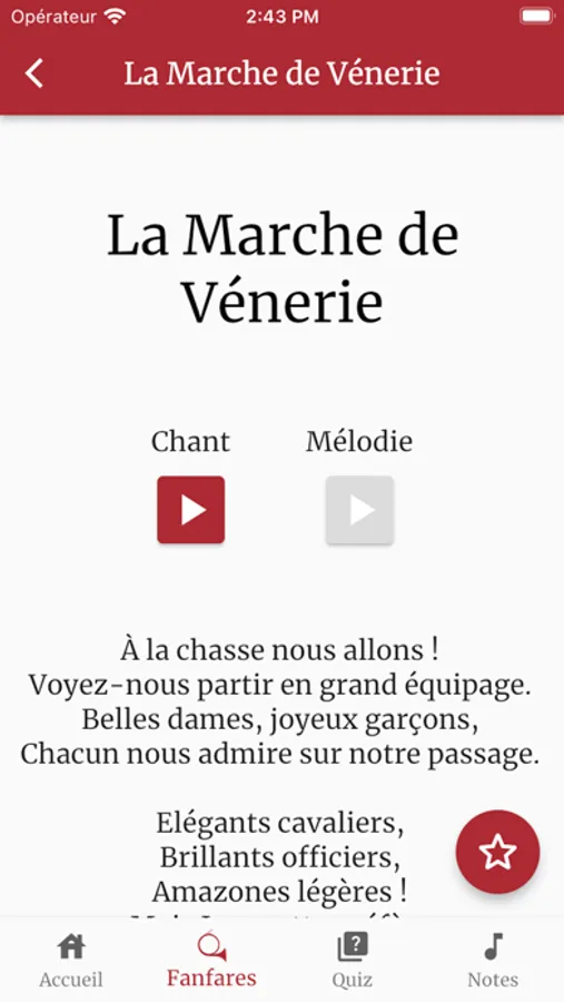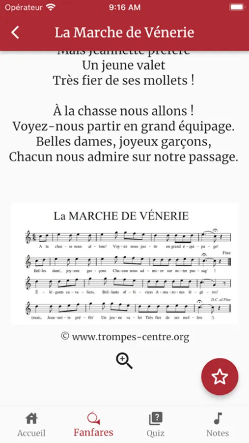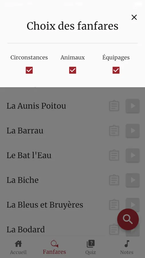 Apprenez à sonner de la trompe de chasse grâce aux nombreuses fanfares disponibles dans l'application, avec leurs partitions chantées.