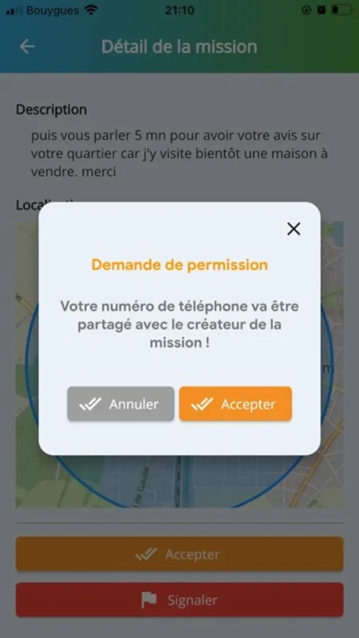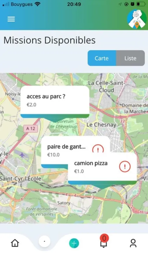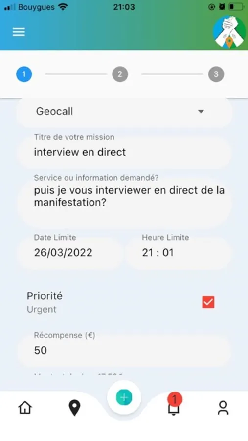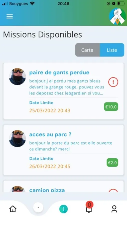 Vous recevez une notification à chaque nouvelle mission/géocall disponible et pouvez accomplir les missions/géocalls avec des textes, messages vocaux et des photos.