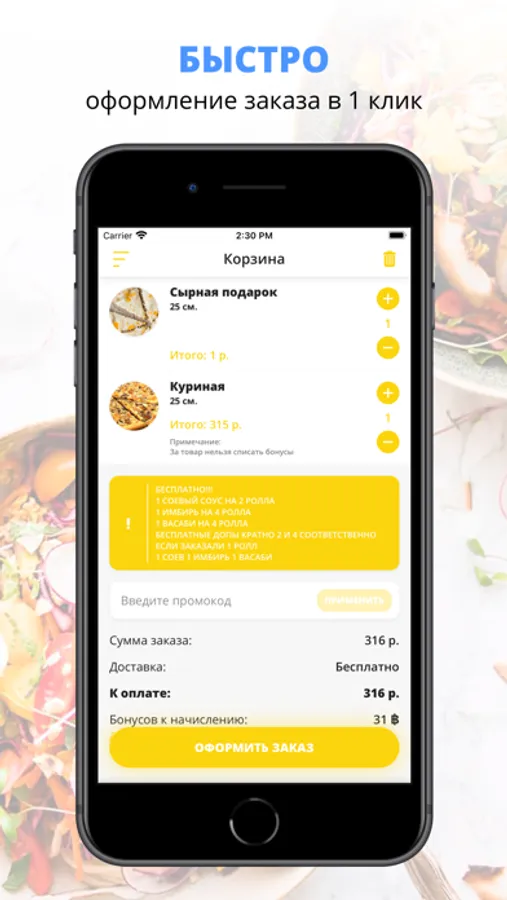 Скачивайте наше приложение, оформляйте заказ и наслаждайтесь любимой едой, где бы Вы ни были! Приятного аппетита!