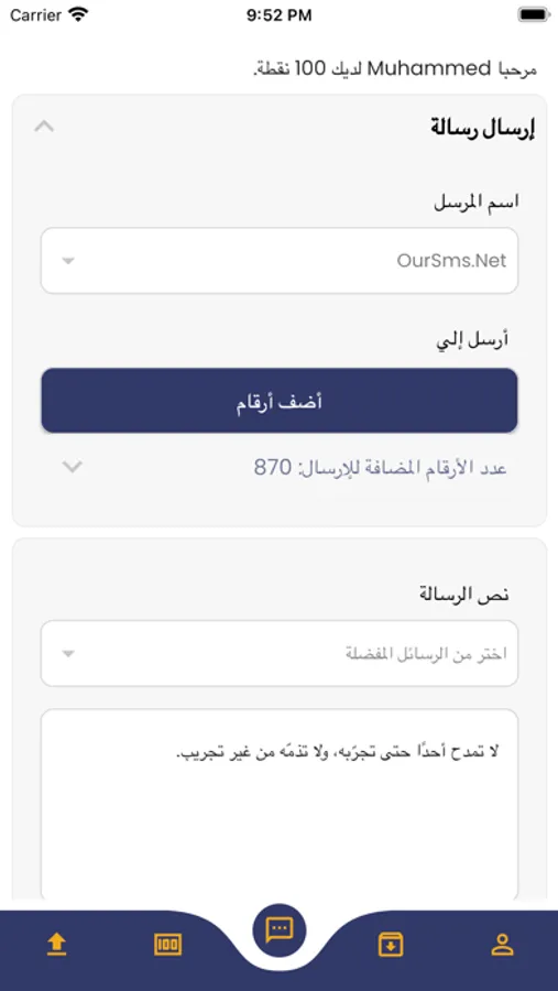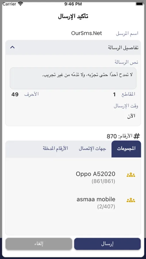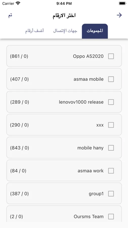 لإرسال رسائل الجوال Bulk بسهولة الاختيار من الارقام و المجموعات المسجله لديك في حسابك و يمكنك الاختيار من جهات الاتصال الخاصه بك