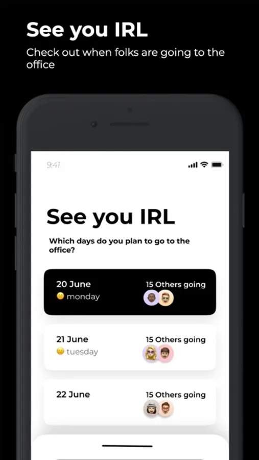 See You IRL : Share which days you plan to get into the office during the following week. See when other folks are coming in.