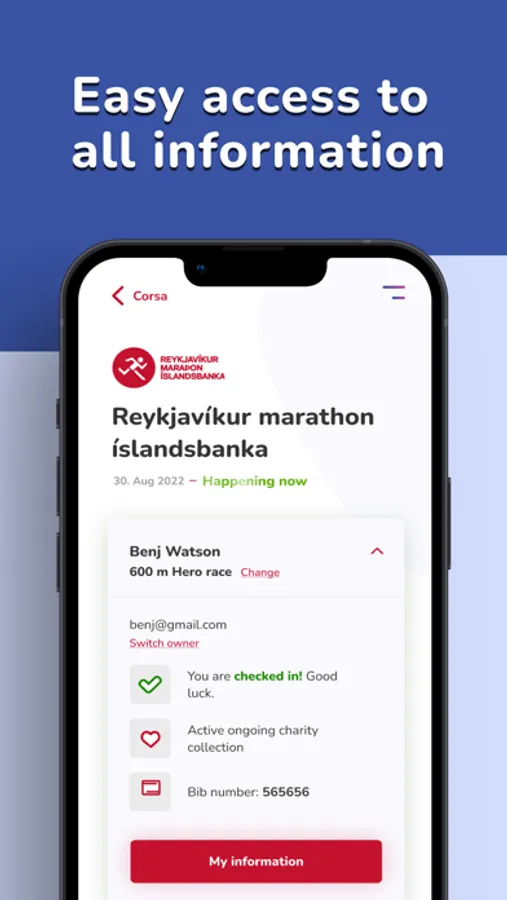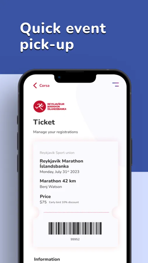 When an event is coming up you can use Corsa in order to pick up information from the organiser such as bib numbers or other information from the event organiser. The app provides you with a barcode that the organiser uses to make sure you are handed the things you are supposed to get in order to prepare for the event.