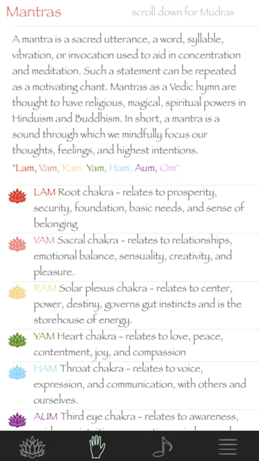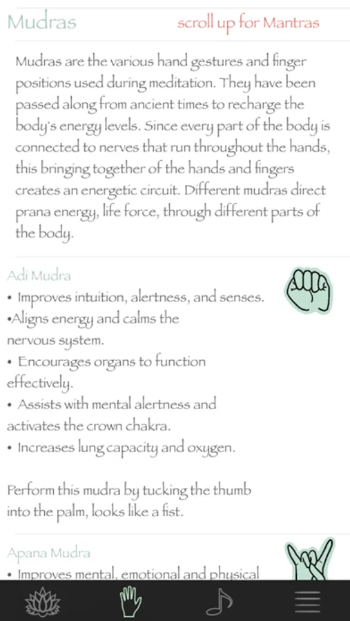 Mudras (hand gestures) and Mantras (chants) are used to optimize and tap into the healing power of hand positions and sounds in mediation.