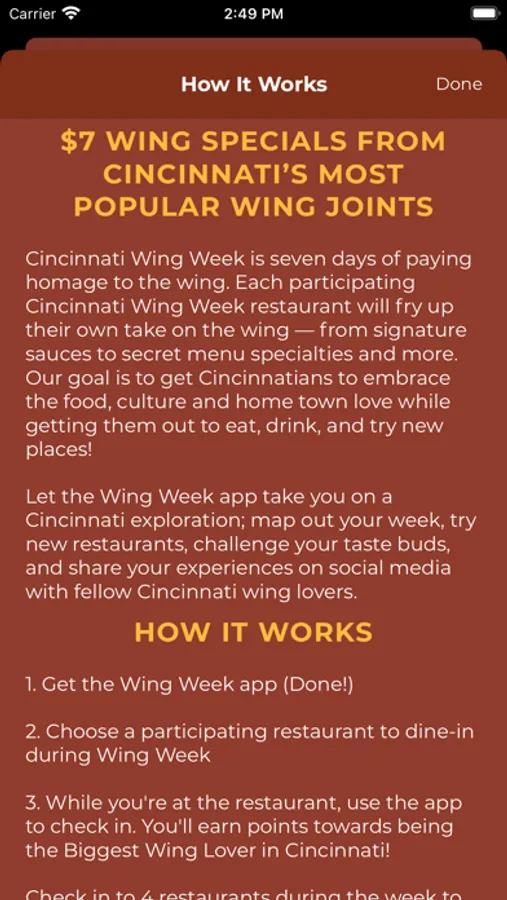 Let the Wing Week app take you on a Cincinnati exploration; map out your week, try new restaurants, challenge your taste buds, and share your experiences on social media with fellow Cincinnati wing lovers.