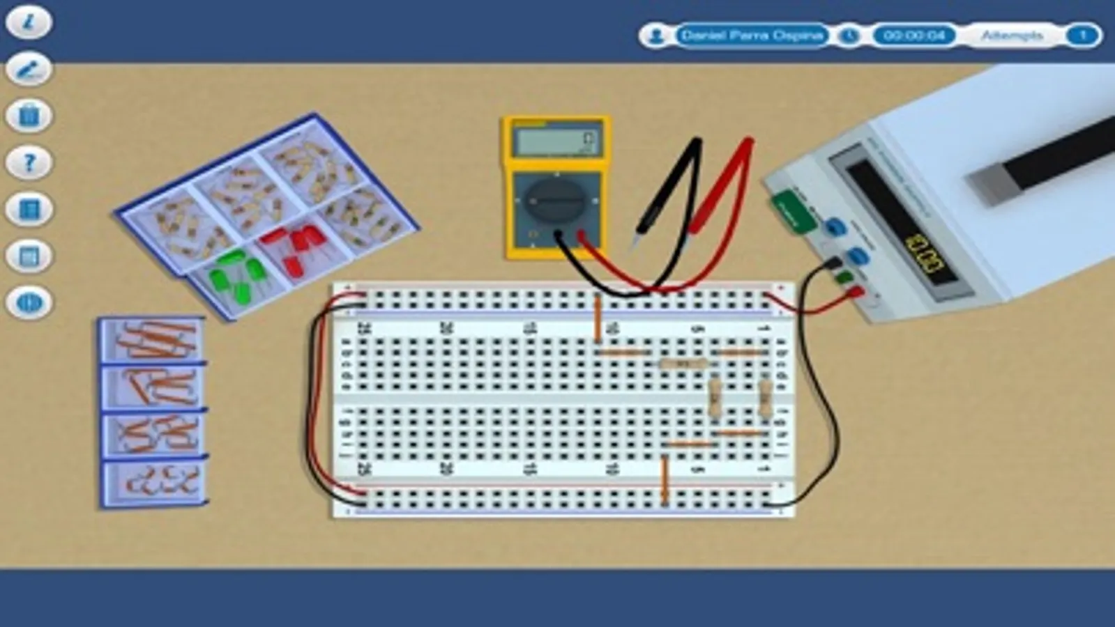 In this simulator, Ohm's law must be used to find the value of three resistors in a mixed circuit, whose colored bands have been erased. For the development of this practice, the current and voltage that circulate in the circuit must be measured. The laboratory has a voltage source, a breadboard, a multimeter, resistors and connection cables.