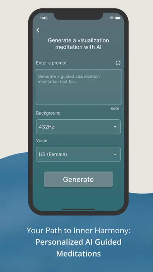 2. Personalized AI-Generated Meditations: Experience guided meditation sessions created for you based on your prompt by AI algorithms, offering tailored visual journeys that foster deeper relaxation, concentration, and positivity. Whether envisioning your aspirations or immersing in tranquil landscapes, these meditations enhance your mindfulness practice.