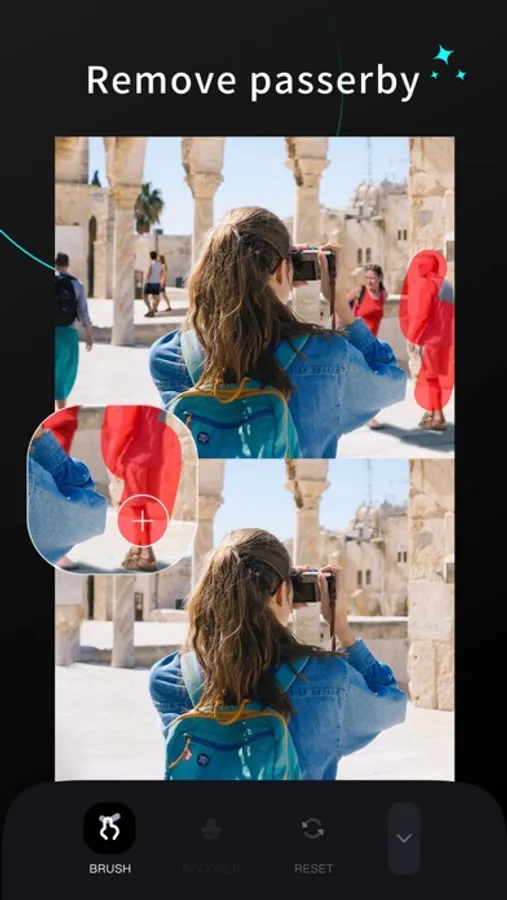 -[Passersby removal] In addition to manual wiping, you can circle the area to be removed using an intelligent rope, and then delete unwanted persons and objects with one touch. The operations are simple, easy, and quick. Even a green hand can do erasing like a master.