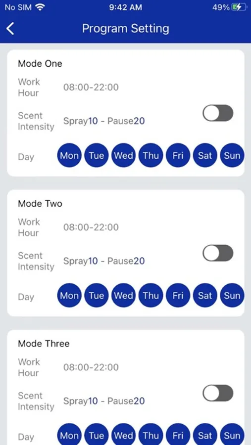 ScentLife Application could connect the scent machine to control globaly by 2.4G, also has the Bluetooth control, ,the functions are as bellowing: