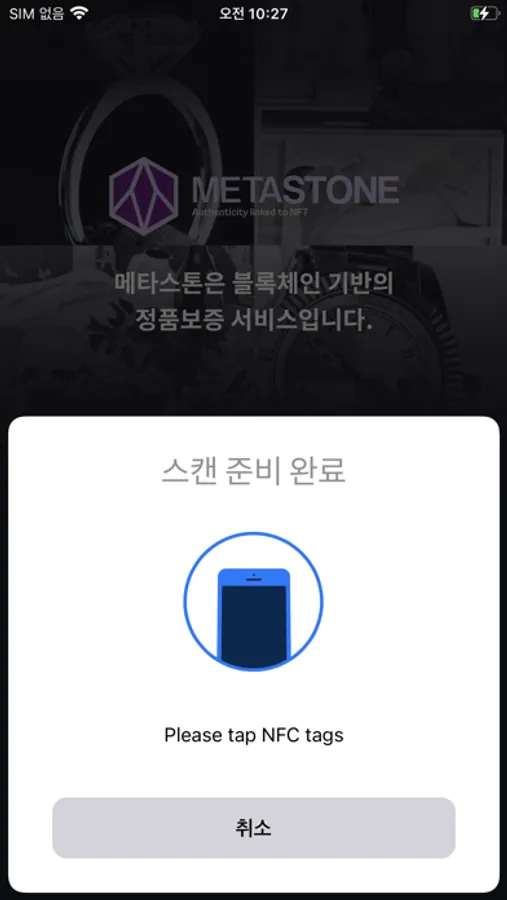 사용자가 메타스톤 카드를 스마트폰의 뒷면에 터치하면 보유하고 있는 실물자산의 정품 보증서를 메타스톤 앱에서 간편하게 확인할 수 있습니다.