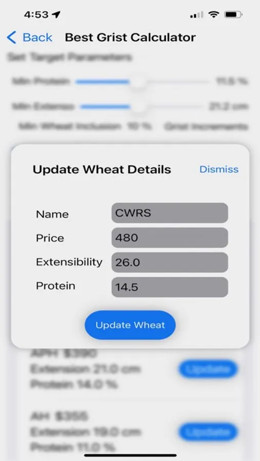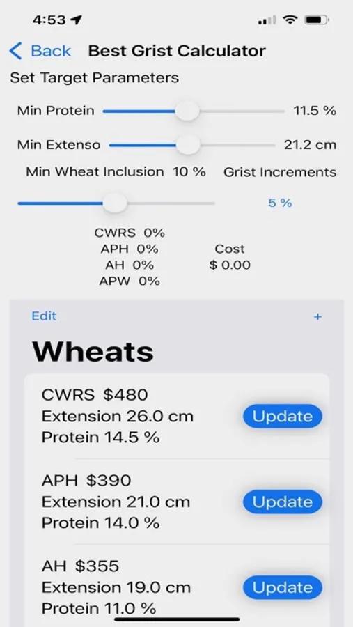 In addition a flour blending calculator is included. This calculates the best priced grist to target protein level and Extensibility.