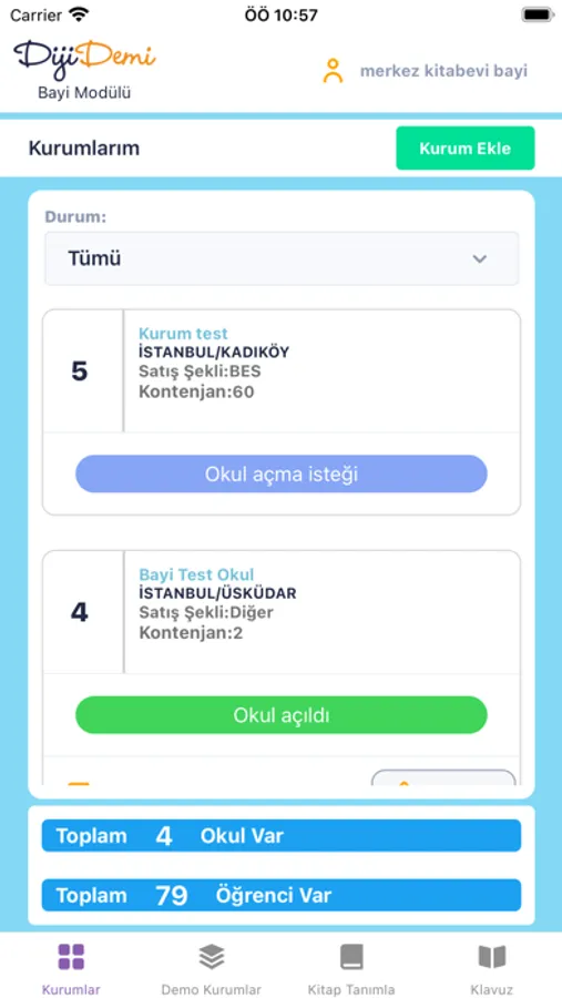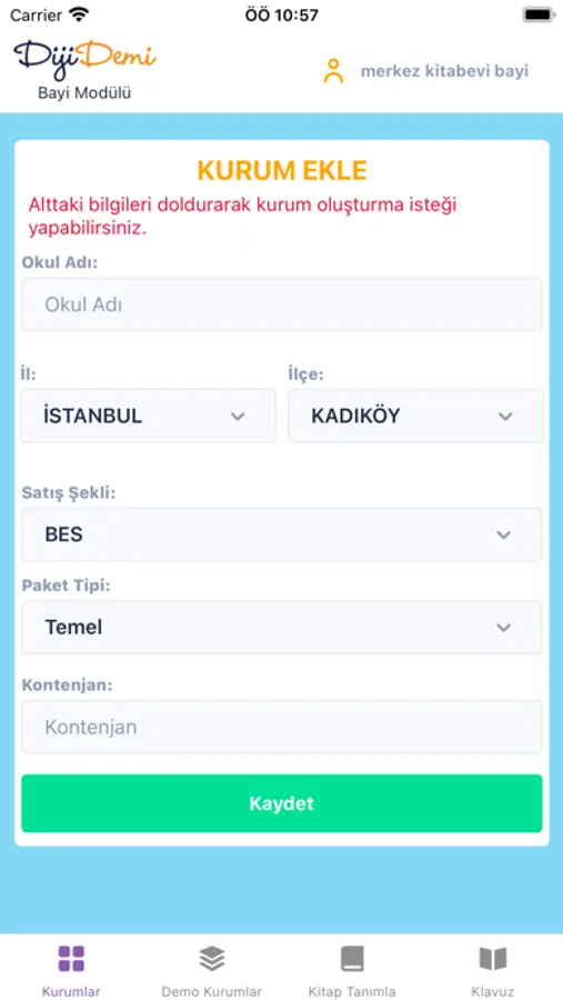 Demo okul açma isteği gönderebilir. Okullar için hangi tür paket kullanacaklarını seçebilir.