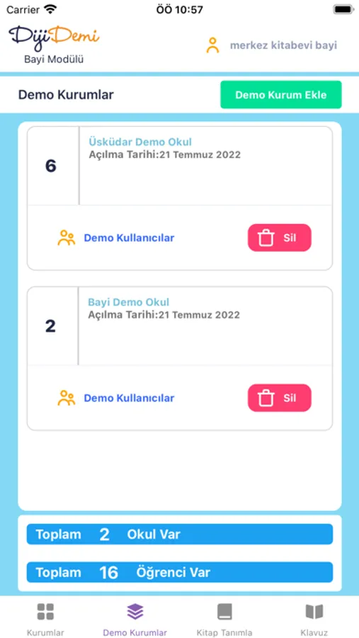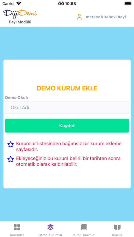 Dijidemi de açılacak okullar için okul müdürlerinin ve bayilerin kullanabileceği mobil uygulamadır. Bu uygulama ile herhangi bir okul müdürü ve bayi okuluna ait kitapları tanımlayabilir.