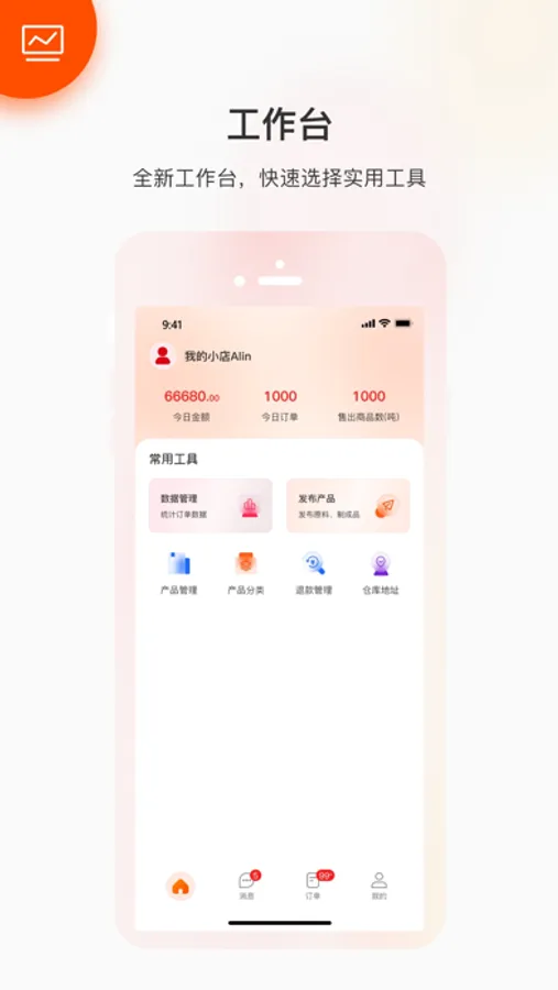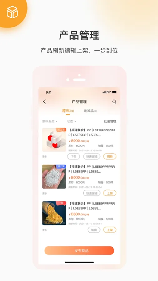 金塑宝商家版app,提供了“原料制成品发布、销售数据分析、退款管理、订单签署发货、仓库地址等便捷功能,帮助企业方便快捷地管理商品及订单等。