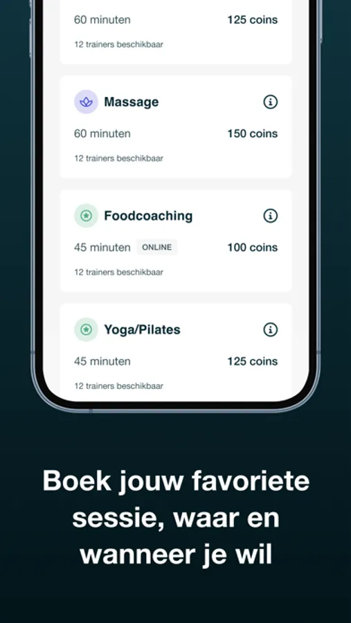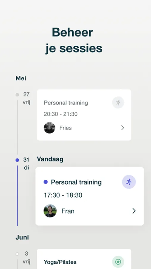 - Export your sessions to your own calendar to stay up to date. Something comes up? You can cancel your session without any problem via the app.