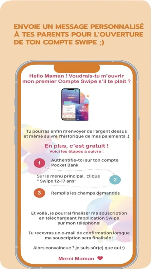 A partir de Pocket Bank (Rubrique Swipe 12-17 ans), les parents peuvent souscrire à l’Offre Swipe pour leur enfant, simplement en saisissant ses informations suivantes : nom – prénom, date de naissance et numéro de téléphone.