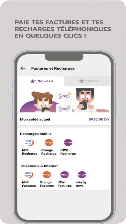 - Avec l’application Swipe : de personnaliser leur carte bancaire, de consulter leur solde, de suivre leurs transactions, de recevoir de l’argent de la part de leurs parents, de payer leurs factures et leurs recharges téléphoniques, d’envoyer de l’argent à un Wallet ou à compte bancaire, payer un marchand à travers un QR code, ainsi que de retirer de l’argent sur les GAB Banque Populaire.