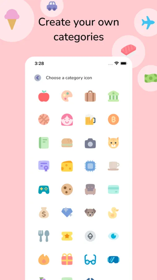 - Customise your own categories with cute icons. There's an icon for you, whether it's for your groceries, travel or pets.