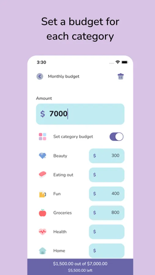 - Set a monthly budget and see at a glance if you're on track for the month or not