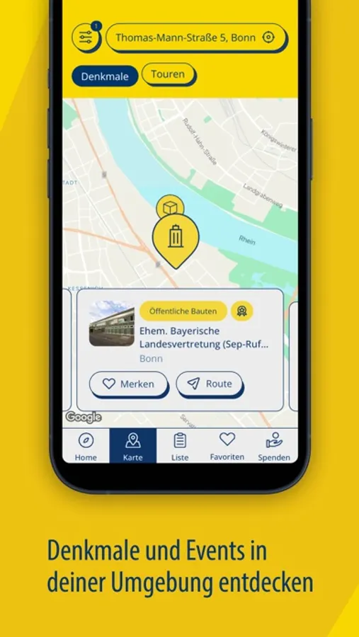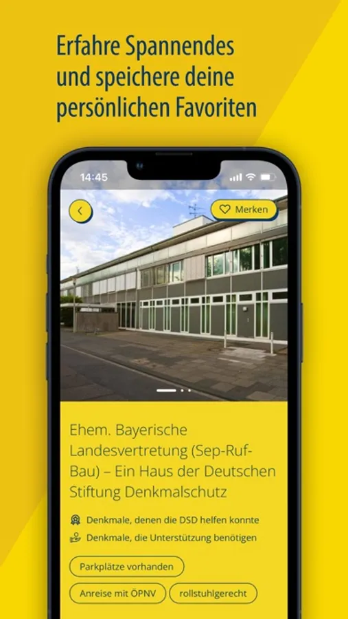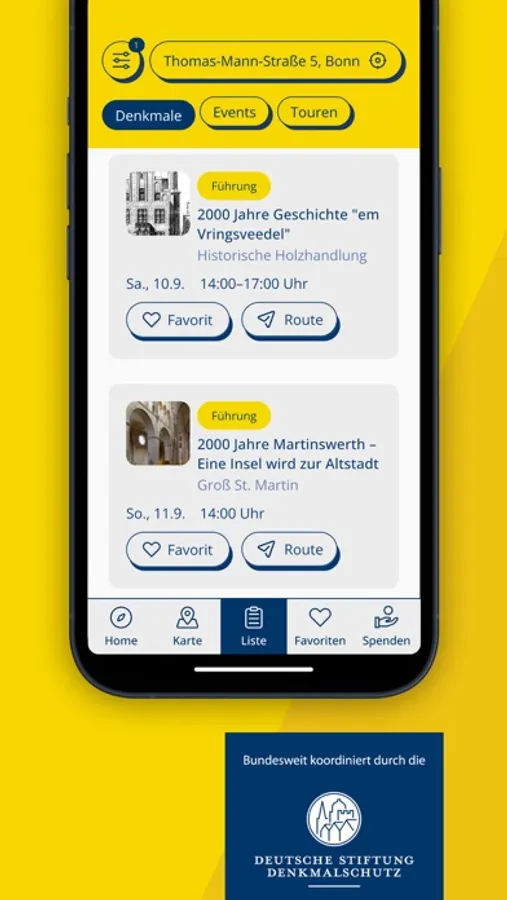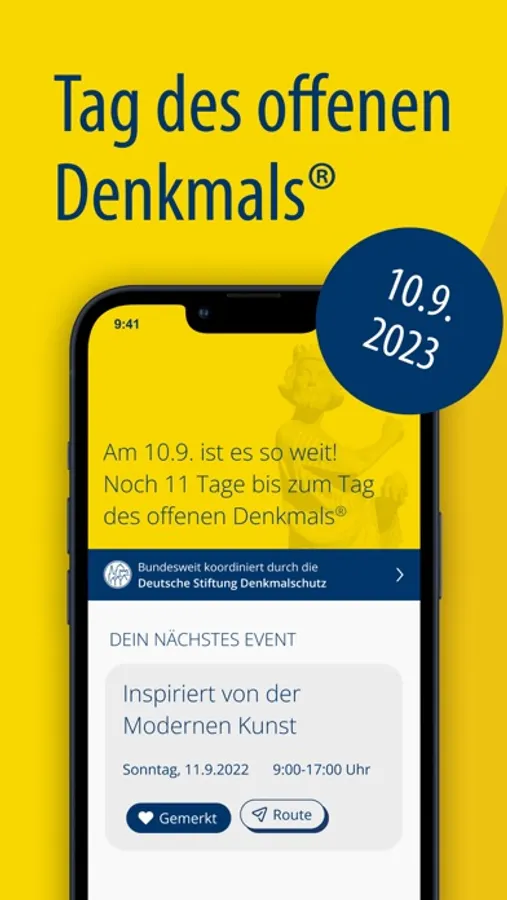 Ihr möchtet Euren Tag des offenen Denkmals vorab planen? Kein Problem! Die spannendsten Events und Orte könnt ihr jederzeit speichern. Dank der Kalender- und Erinnerungsfunktion verpasst ihr nichts, und die Routenplanung hilft Euch am 11. September beim Navigieren von Denkmal zu Denkmal.